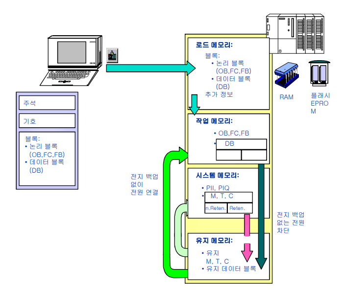 | 시스템 메모리 | PLC의 프로그램의 실행에 필요한 메모리. 사용자가 직저버 사용할 수 있는 메모리 영역으로 타이머, 카운터, 입출력 관련을 처리할 수 있다. | |