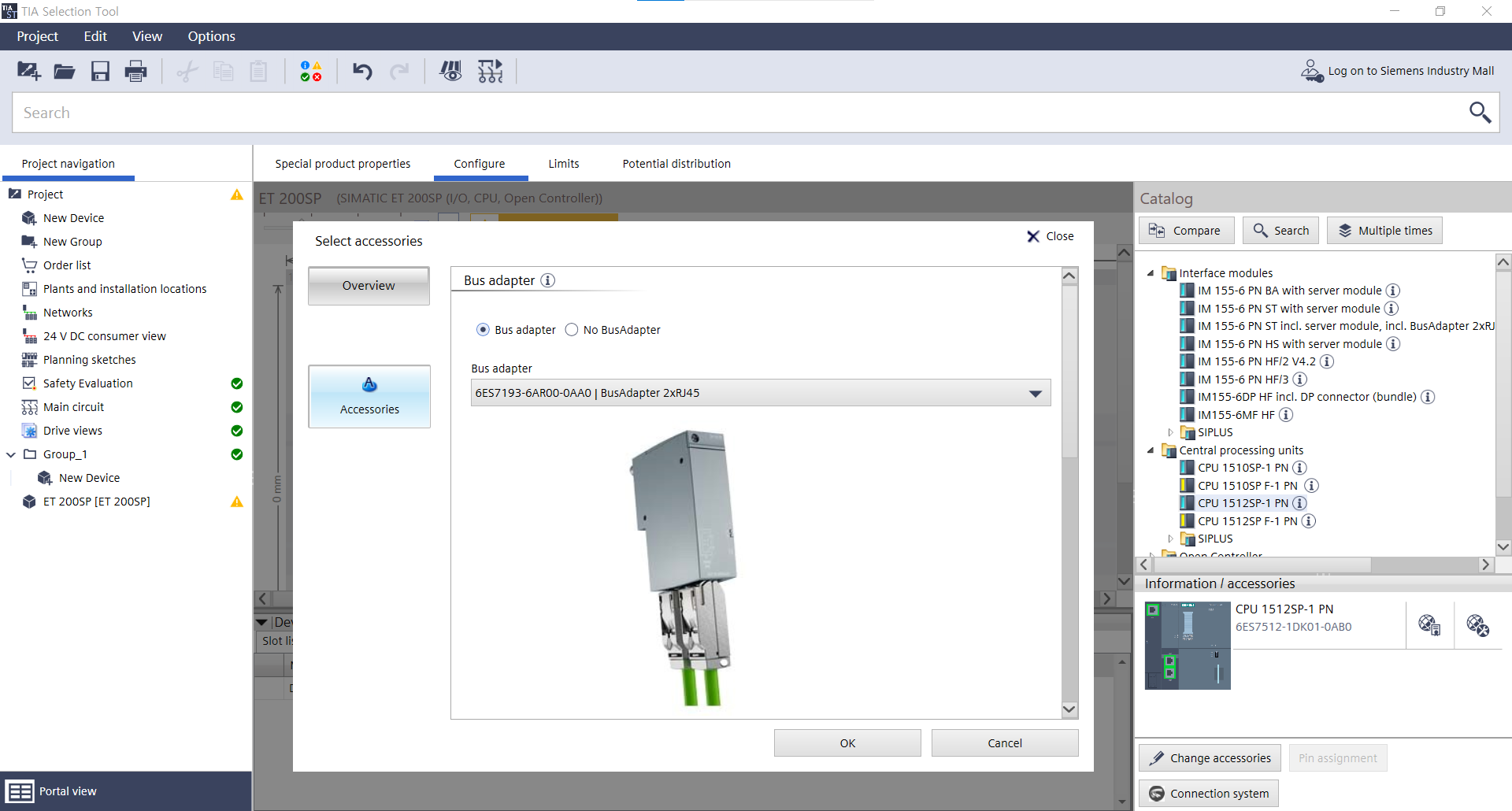CPU를 선택하면 Bus adapter 선택이 나옵니다. ethernet 통신을 하기 위해 필수이므로 선택해주세요. Bus adapter는 그 타입에 따라 RJ45, 광 connector 종류중에 선택할 수 있습니다. 가장 많이 사용하는 2xRJ45를 연습으로 선택해줍니다.