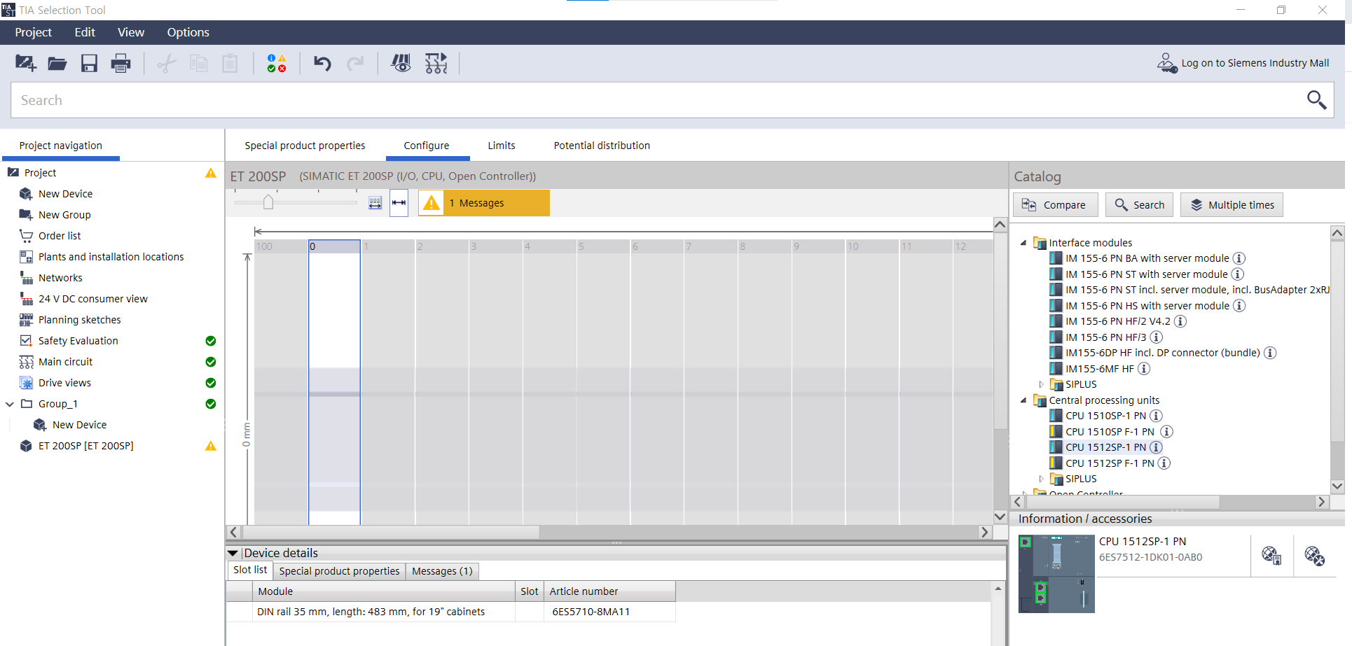 Configure탭에서 자동으로 Din Rail을 보실 수 있습니다. 제일먼저 Cpu를 선택해주어야합니다. Interface modules가 먼저 나오는데요. 이것은 Remote IO용이므로 선택에 각별히 주의해야합니다. Central processig units을 선택해주세요. 필자는 CPU 1512SP-1 PN을 선택했습니다.